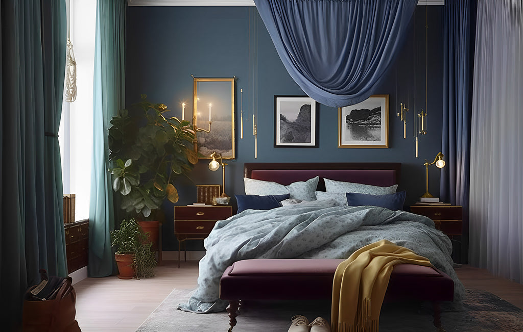 Time to do a bedroom makeover? In a bedroom where bold colors and patterns are the centerpieces, curtains can significantly impact the drama and create a cohesive look. One way to achieve this is by mixing materials for the curtains. Combining different textures like velvet, silk, or satin can add depth and complexity to the room's decor. For example, pairing a deep blue velvet curtain with a patterned silk panel can create a luxurious and elegant ambiance. The contrast between the materials can create visual interest, drawing the eye and adding a sense of richness and texture to the space. Additionally, the tactile feel of the materials can add a tactile dimension to the room, making it feel more comfortable and inviting. You can create a dramatic and sophisticated bedroom that reflects your personality and style by experimenting with different materials.
