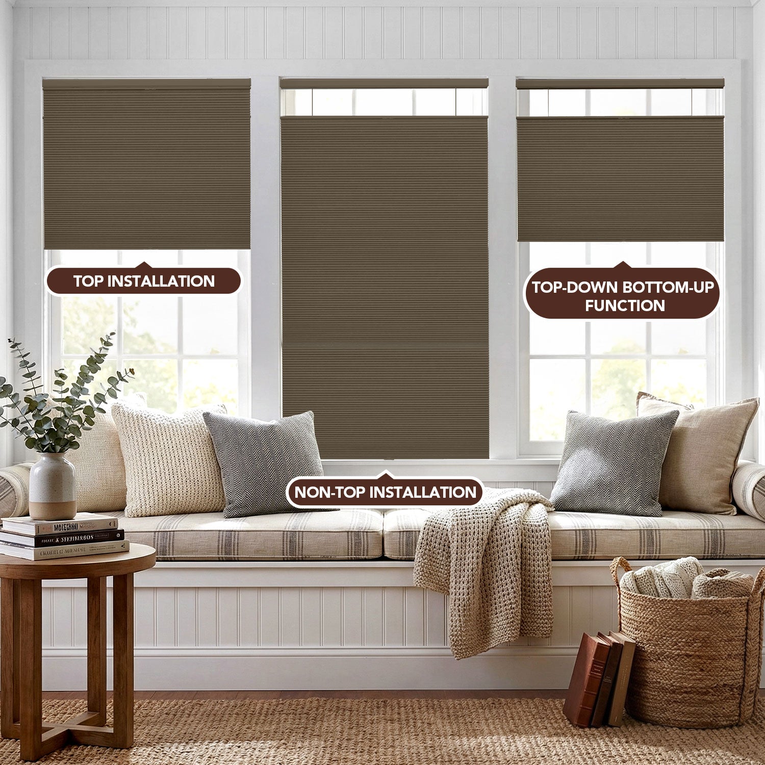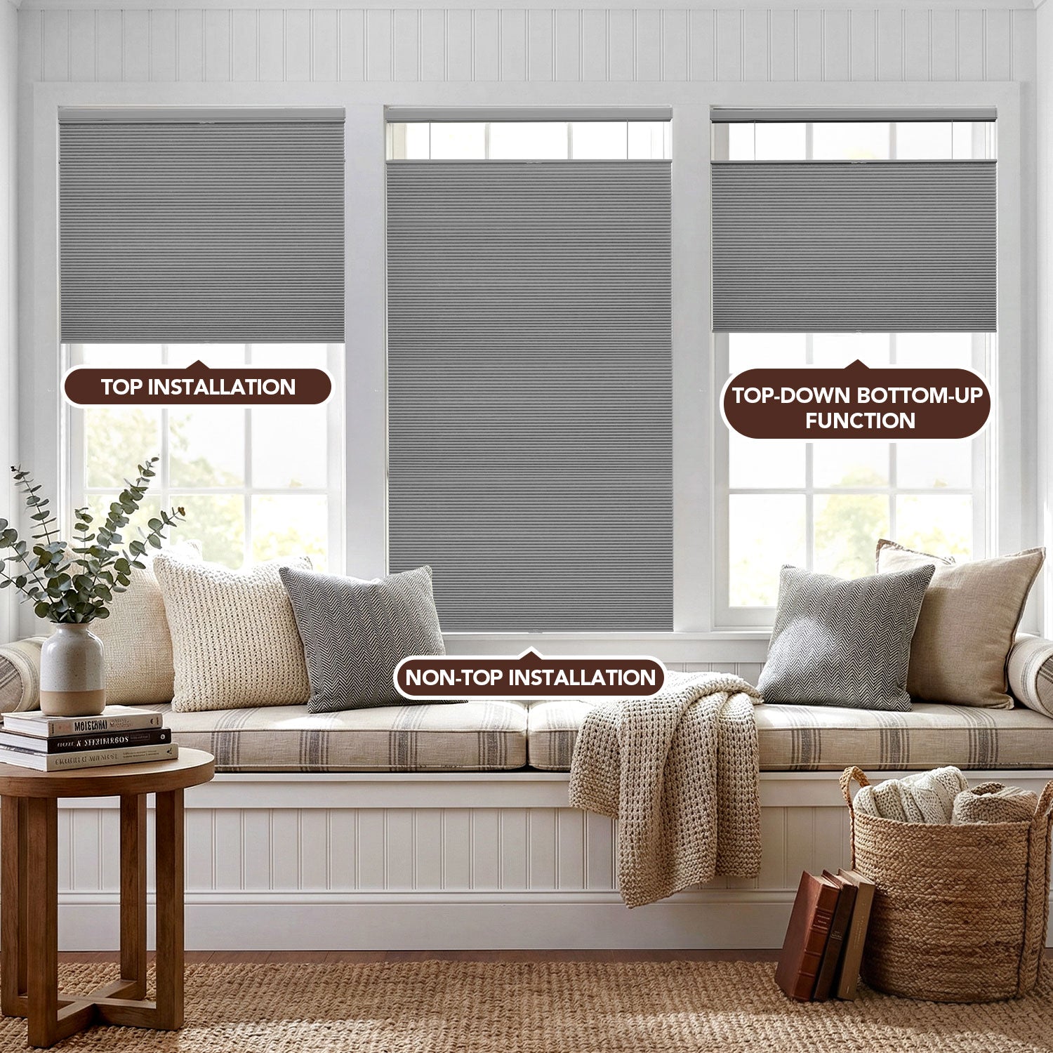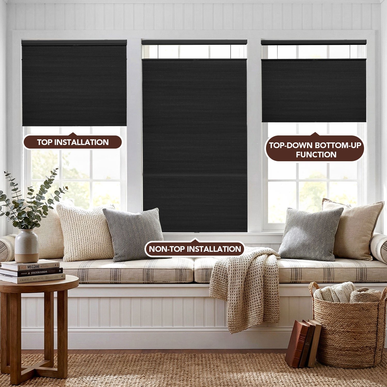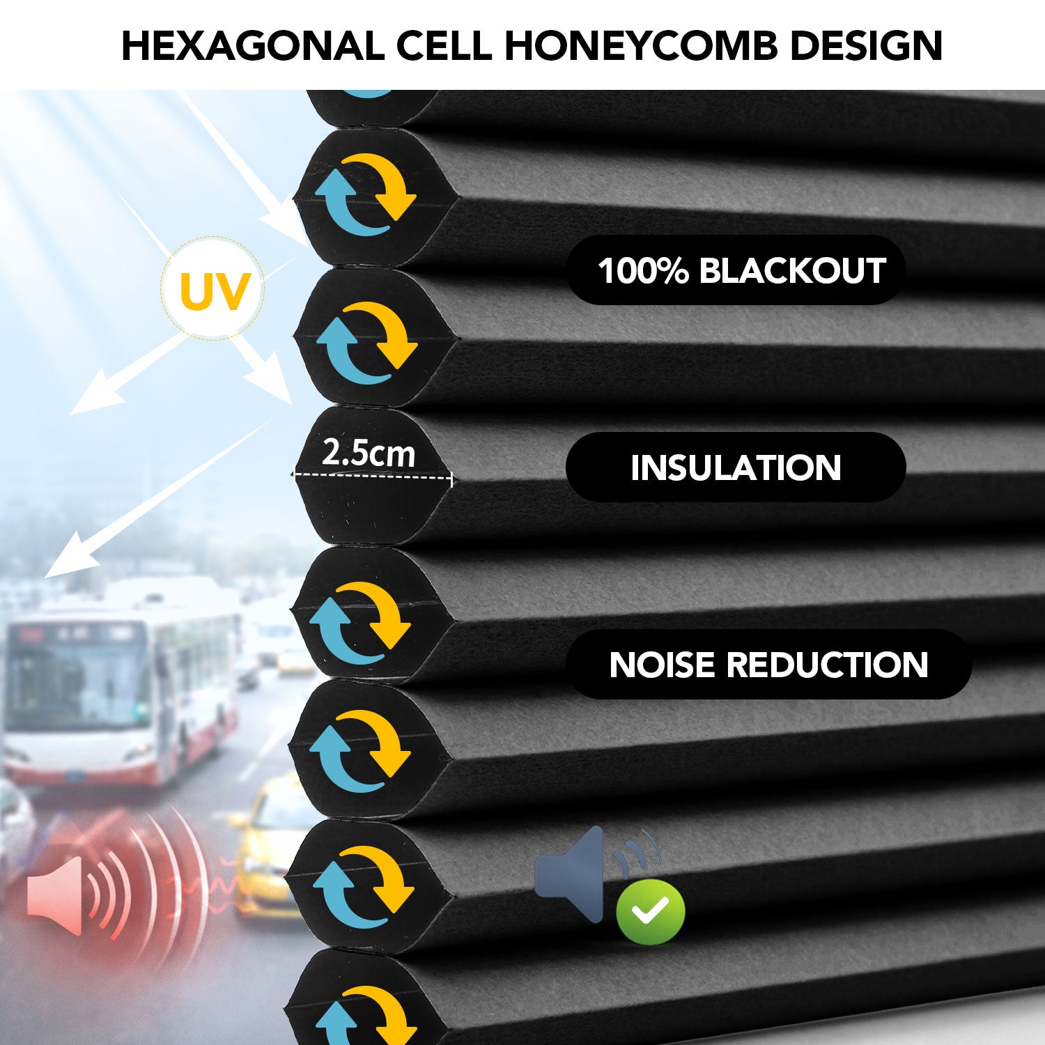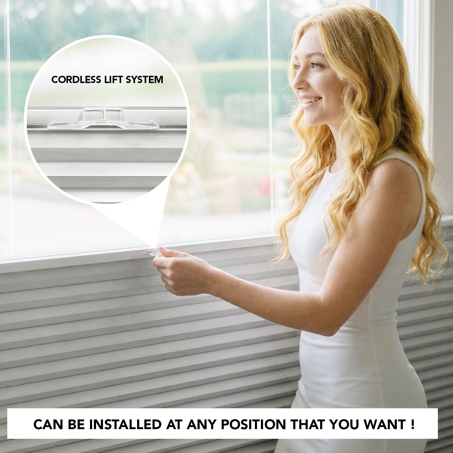 - Top-down/bottom-up design with guiding cords for added stability
